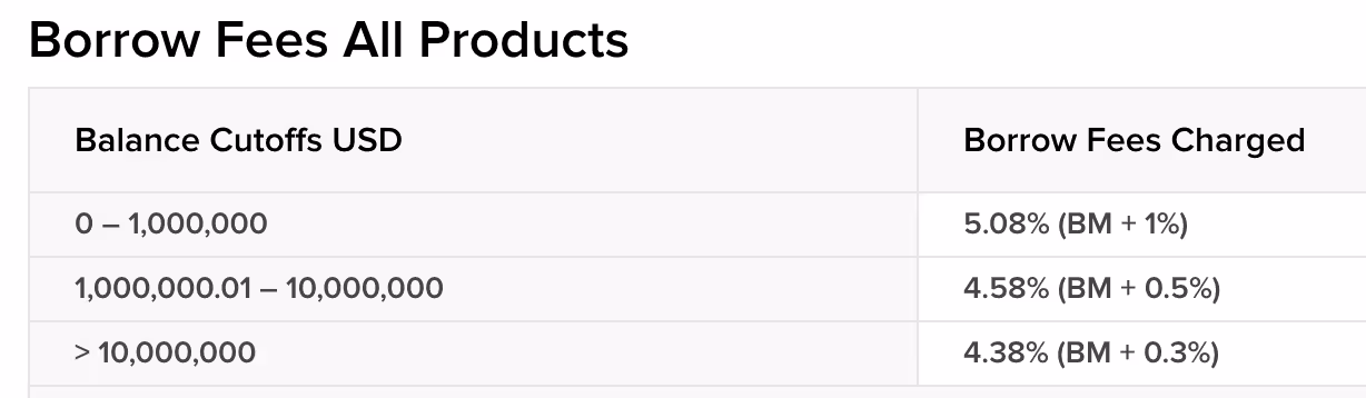 If you trade using margin, IBKR applies its benchmark rate plus a spread based on your borrowed balance. For balances under USD 1 million, the charge is about BM + 1.0%. Larger balances are charged lower spreads.