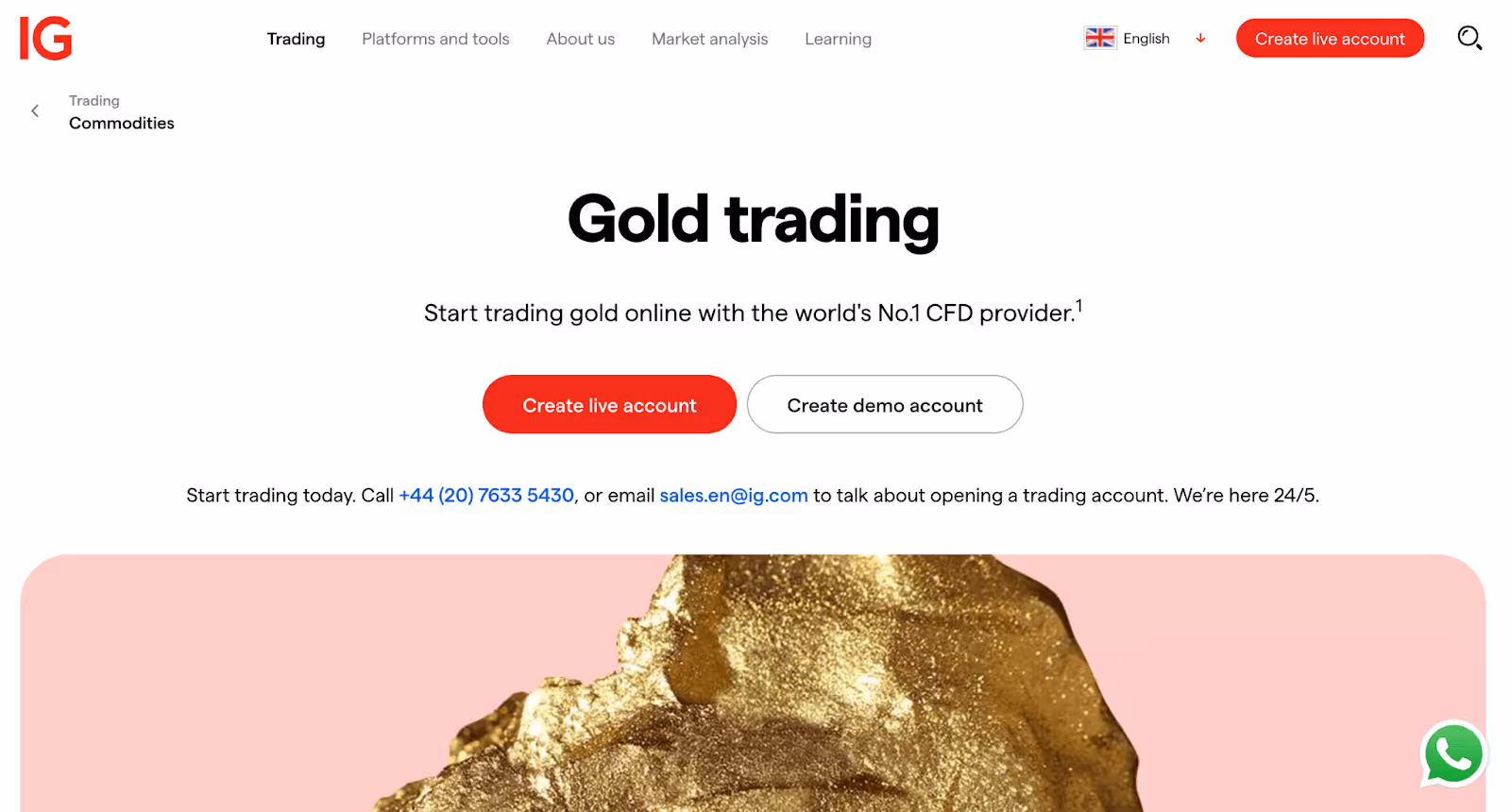 IG uses a spread-only pricing model for gold CFDs. The typical spread on XAU/USD is around $0.3 (30 cents) for the spot CFD.
