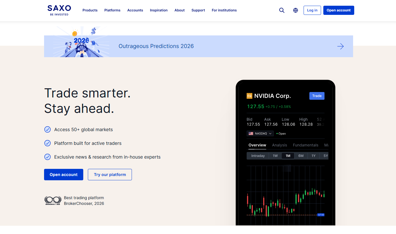 - SaxoTrader for advanced trading with professional charting, risk tools, and order types.