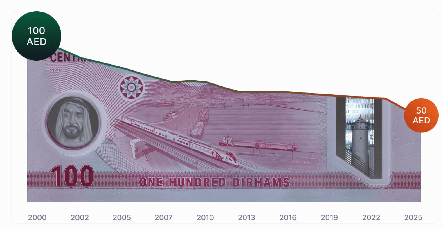 Based on the UAE consumer price inflation, 100 AED in 2000 was only worth only 50 AED in 2024. This means a continuous, subtle loss of purchasing power over time, as you can see from the image below: