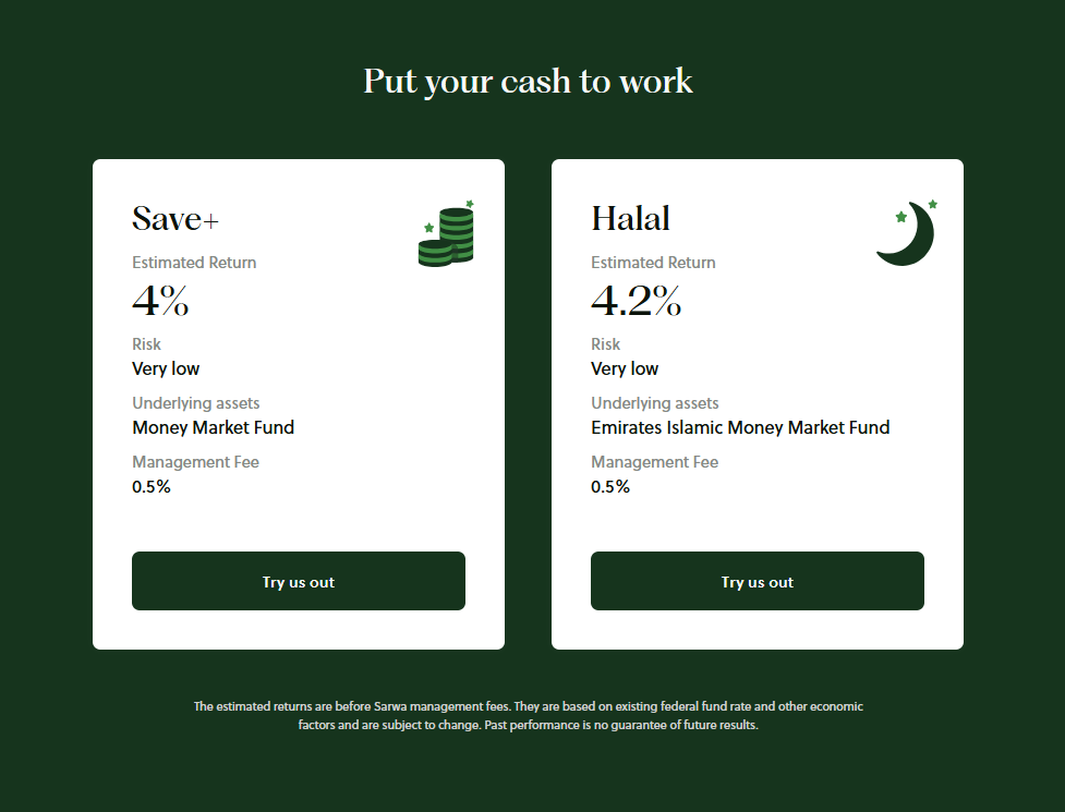 Sarwa Digital Wealth (Capital) Limited is a UAE‑based fintech platform (founded in 2017, headquartered in Abu Dhabi) offering a suite of financial services, including Sarwa Save which provides a cash‑management fund offering estimated returns (e.g., 4.0% for Save+ or 4.2% for Halal variant), with no lock‑in, no minimum balance, and zero withdrawal fees.