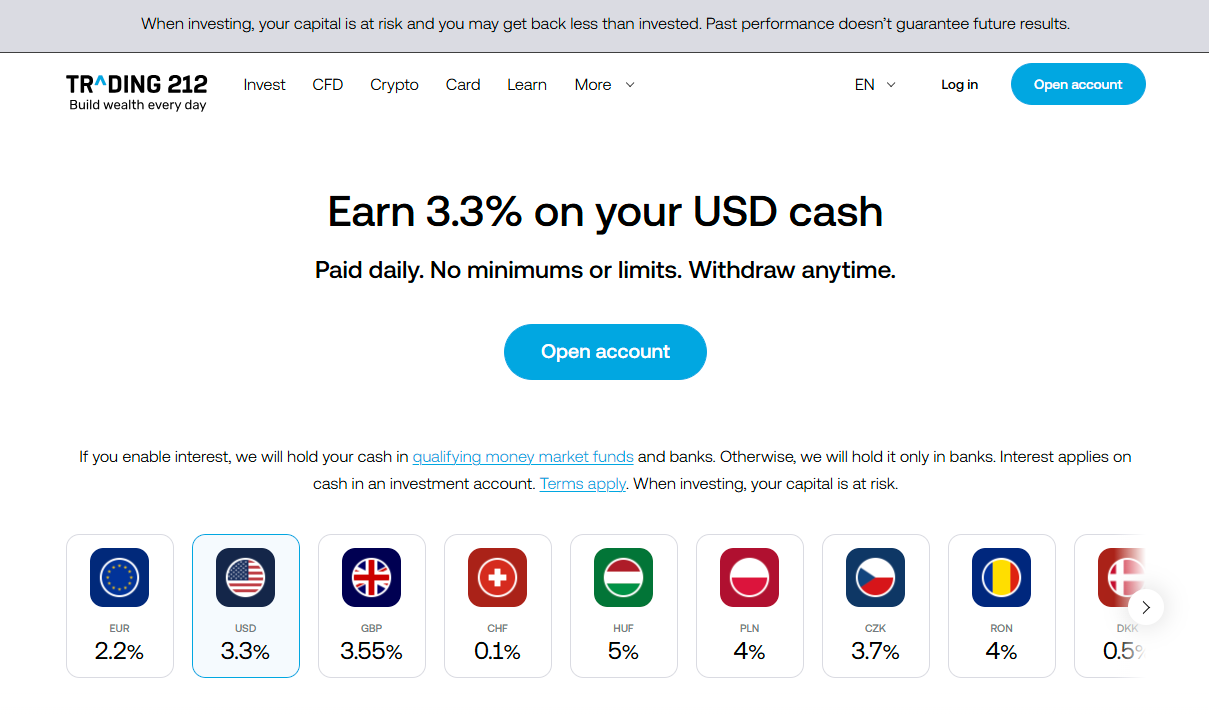 - USD: no interest on first USD 10,000; balances above earn up to 3.14% (IBKR Pro)