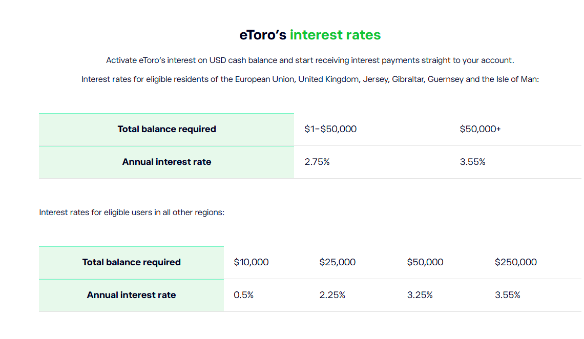 eToro allows you to earn interest on uninvested USD balances, giving you passive earnings directly in your account with monthly payments (Interest is paid into your eToro balance every month) and no lock-in (funds remain fully liquid; withdraw at any time).