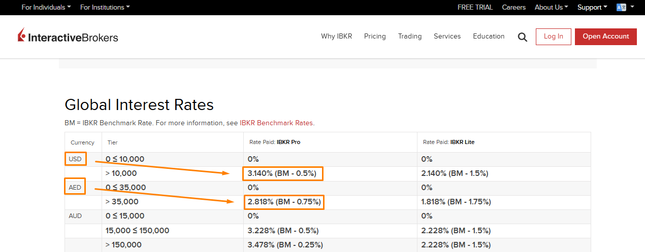 - AED: no interest on first AED 35,000; above that, 2.818% (IBKR Pro)