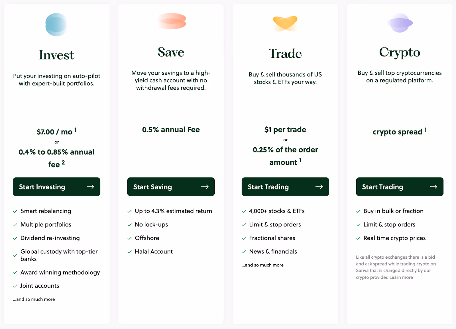 Fees and commissions charged by Sarwa depend on the product you use: Invest, Trade, Crypto, or Save. Each has its own fee structure. Here’s the breakdown: