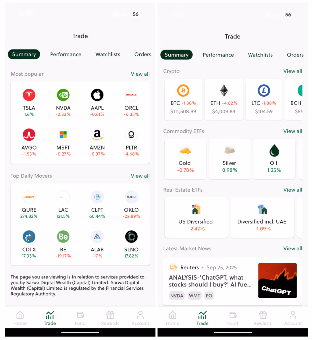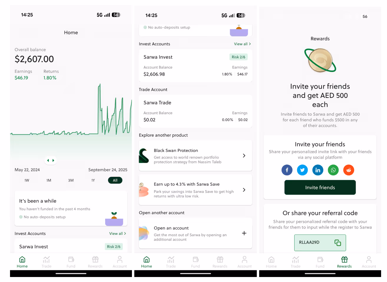It also allows you to access Sarwa Save, enabling you to park cash and earn interest directly within the app. The interface is clean and intuitive, designed for ease of use.