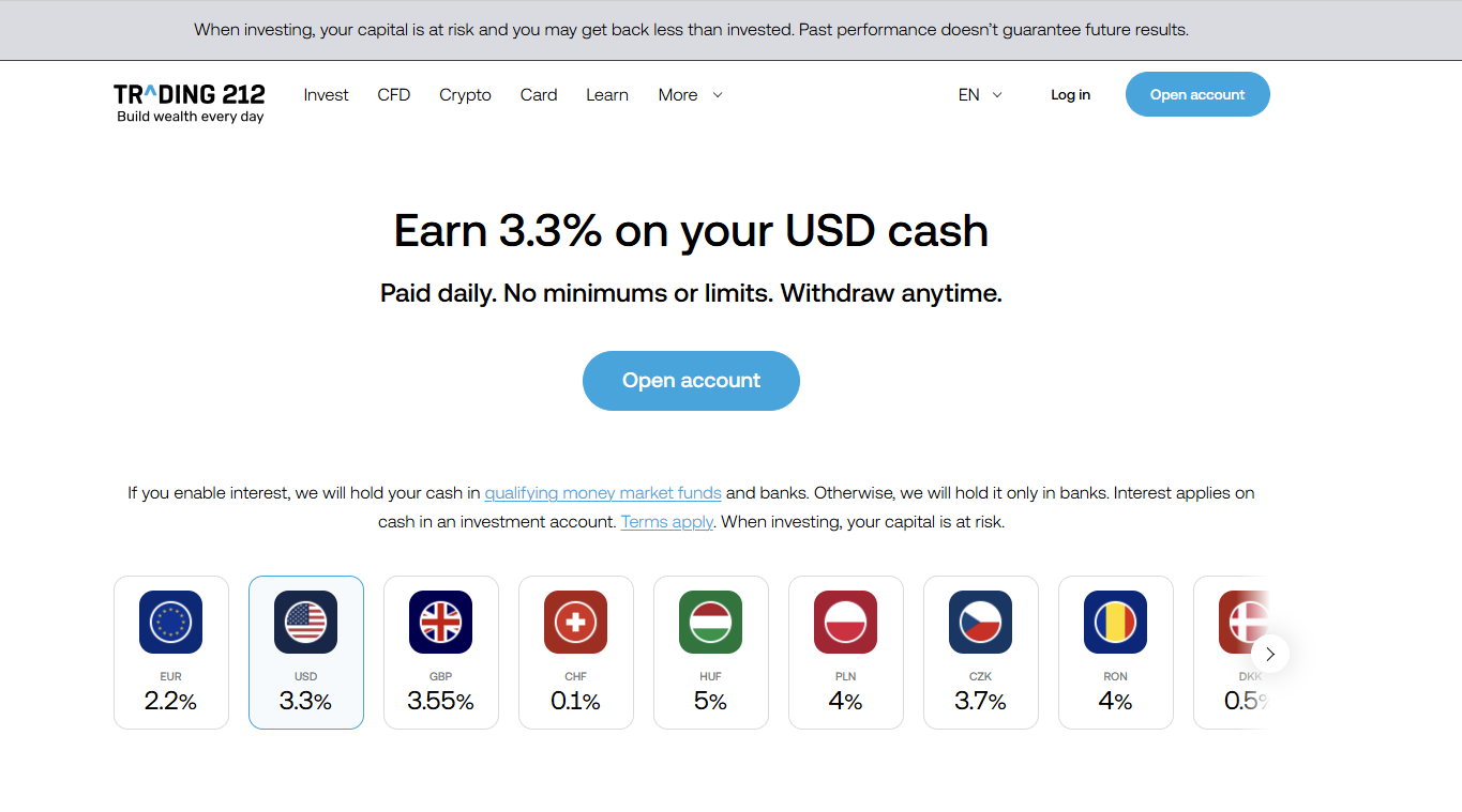 Trading 212 is among the more generous platforms in terms of interest paid on idle cash. Your cash is placed in a mix of time deposits and money market funds (which invest in short-term debt from EU member states). These are the interest rates as of February 2026: